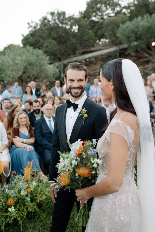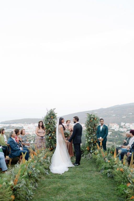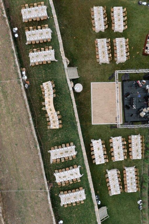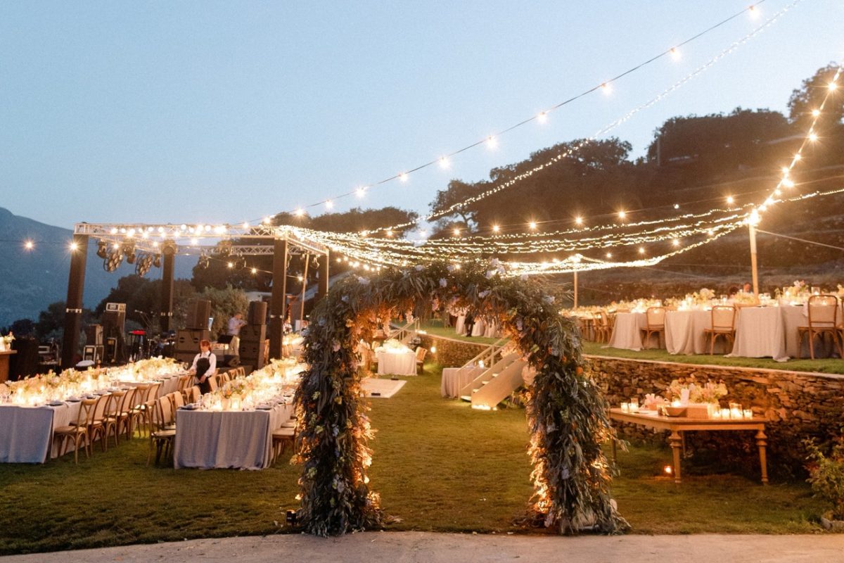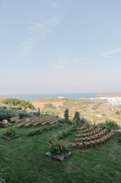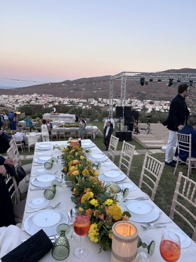 Ο χώρος προσφέρεται ιδανικά για γάμους, βαπτίσεις, εταιρικές εκδηλώσεις και ιδιωτικές δεξιώσεις. Η τελετή μπορεί να πραγματοποιηθεί στον ανοιχτό κήπο με φόντο τη θάλασσα και τα νησιά του Αιγαίου, ενώ η δεξίωση λαμβάνει χώρα στην εντυπωσιακή πετρόχτιστη αυλή ή στους κομψούς εσωτερικούς χώρους. Κάθε εκδήλωση συνοδεύεται από εκλεκτούς τοπικούς μεζέδες και τα βραβευμένα κρασιά παραγωγής του κτήματος — Ασύρτικο, Ροζέ και ερυθρό — που προσδίδουν αυθεντικό ανδριώτικο χαρακτήρα σε κάθε στιγμή της βραδιάς.