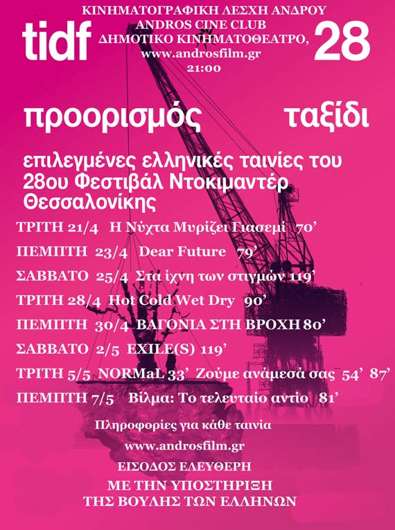 Η Κινηματογραφική Λέσχη Άνδρου παρουσιάζει και φέτος αφιέρωμα στο ελληνικό ντοκιμαντέρ, φιλοξενώντας 17 επιλεγμένες ταινίες από το 28ο Φεστιβάλ Ντοκιμαντέρ Θεσσαλονίκης. Οι προβολές πραγματοποιούνται κάθε Τρίτη, Πέμπτη και Σάββατο στις 21:00, από τις 21 Απριλίου έως τις 30 Μαΐου 2026, στο Δημοτικό Κινηματοθέατρο Άνδρου στη Χώρα.