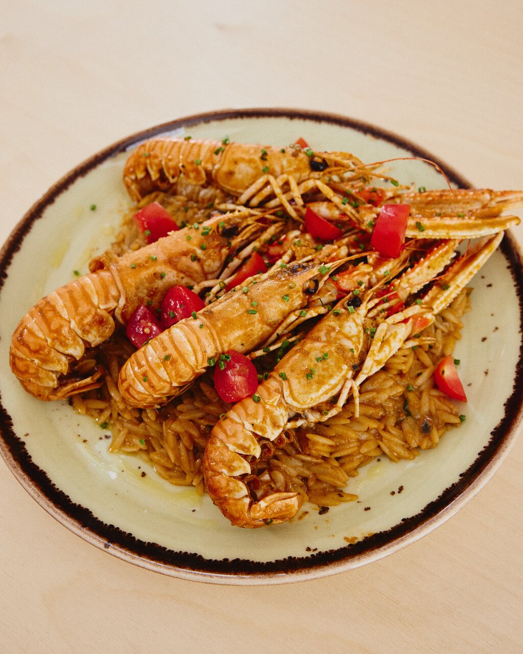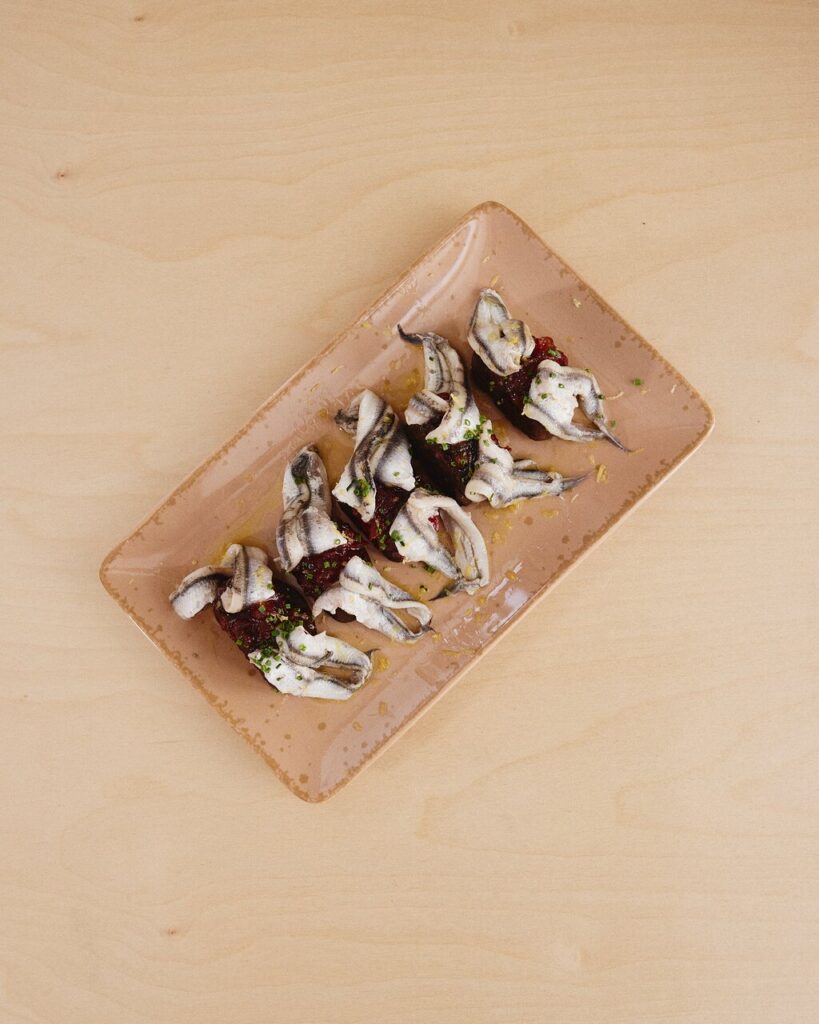 γαύρος μαρινάτος πάνω σε ντακάκι χαρουπιού με μαρμελάδα ντομάτας και φρέσκα μυρωδικά.